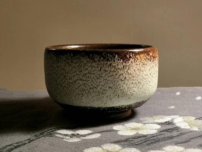 祖師謂「紅爐頭上一點青雪」。參禪,原為於三界火宅中獲得涅槃涼止之雪,亦本是「烈焰爐中撈明月」。悅好這只茶盌,唯因內底燒紅如爐炭,而雪降紛然。故以之紀念「千家流」之合會。