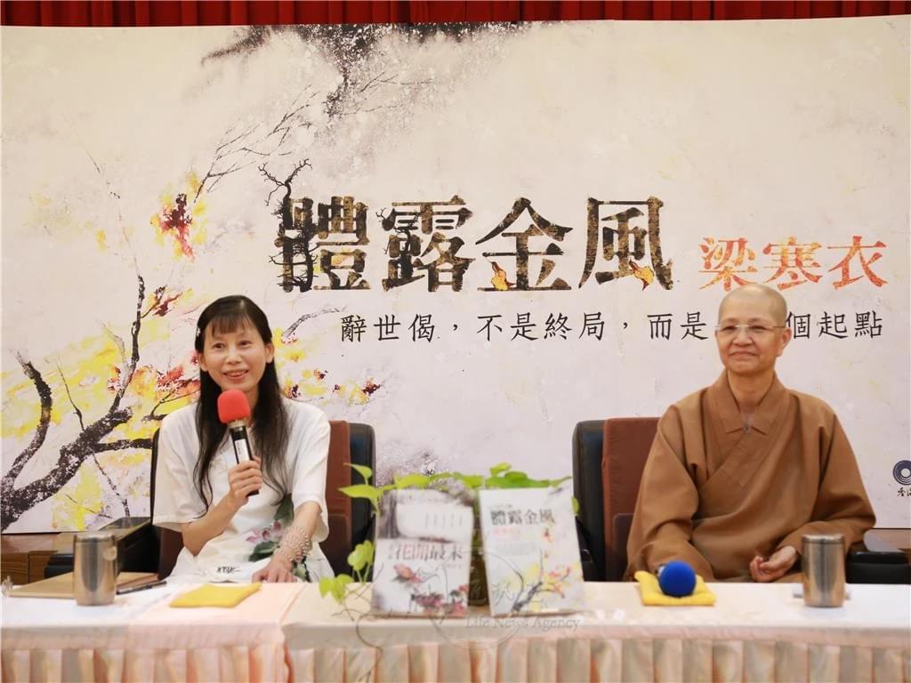 左:梁寒衣,右:永本法師(佛光大藏經主任)。主題:「禪」與「教」的深心對話。于桃園市「中壢禪淨中心」。