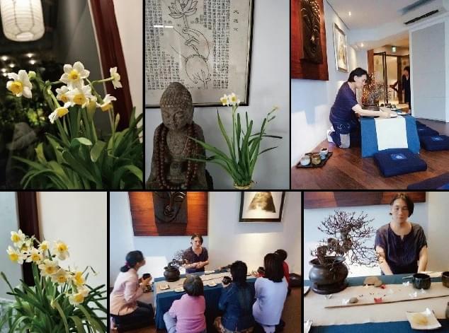 這個新年,文玉攜來大量水仙,是個「水仙花供」,所有賀年者皆得到一小缽水仙。茶桌也布置得格外清雅:老樹蒼勁,盈盈紙蝶散灑棲息於桌面,是個寂麗的禪茶會。飲完茶,方開始電影。
